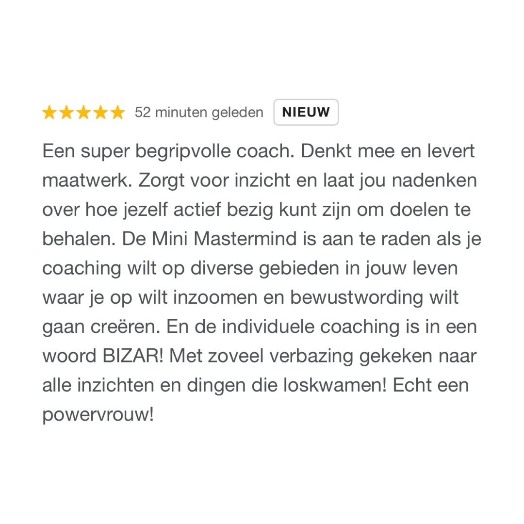 Een krachtige 1-1 (online) coachingsessie die je helpt om met concrete handvatten, hernieuwde energie en frisse inzichten aan de slag te gaan.